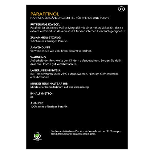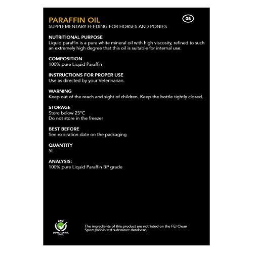 Specification: Paraffin Oil is een wetenschappelijk onderbouwd voedingssupplement voor uw paard of pony (In te zetten bij obstipatie van het maagdarm- systeem ter preventie van verstoppingskoliek bij het paard.)
